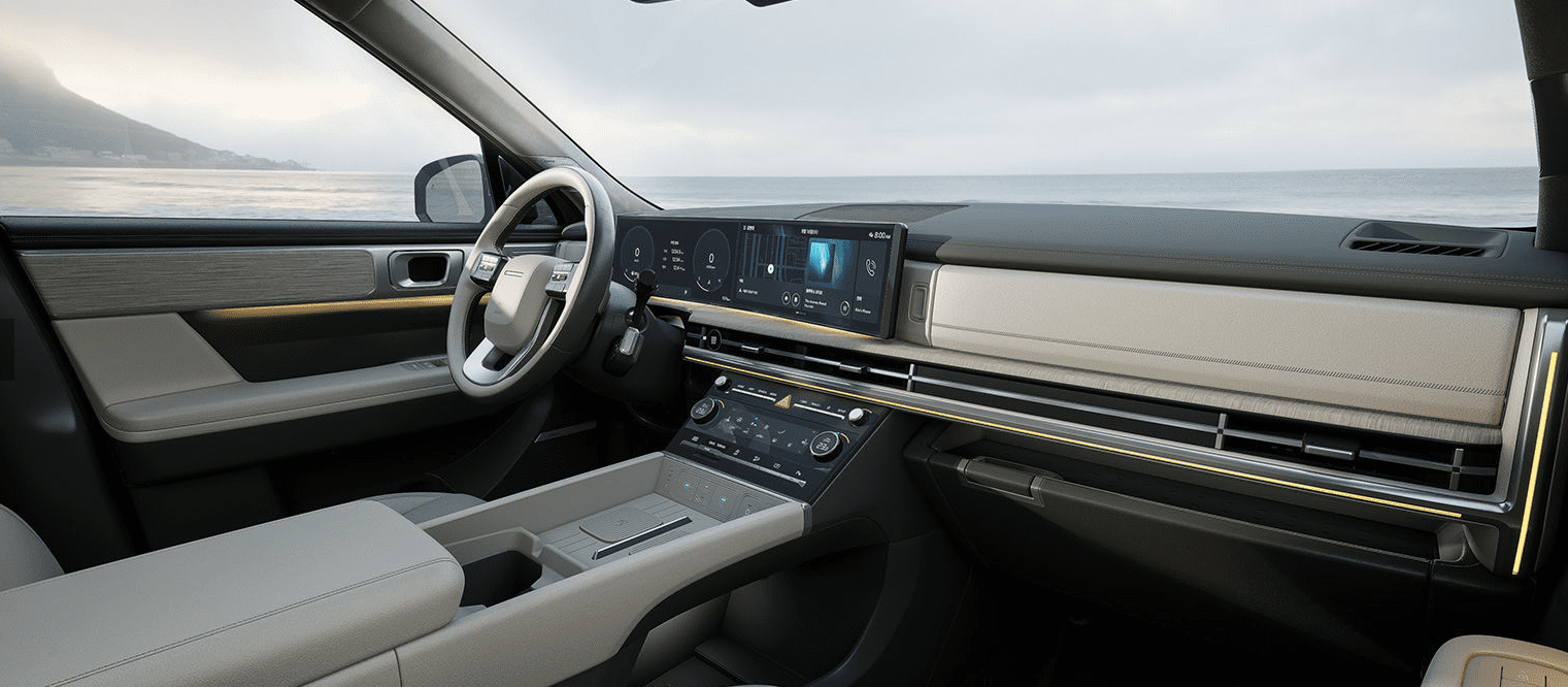 파노라믹 커브드 디스플레이로 12.3인치의 디지털 클러스터와 12.3인치의 인포테인먼트 시스템으로 구성된 디스플레이를 곡선의 형태로 연결하여 고급감을 높이고 와이드 하고 하이테크 한 이미지를 전달합니다.