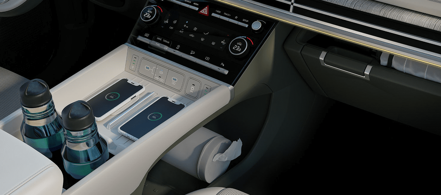 1열뿐만 아니라 2열에서도 오픈이 가능한 양방향 멀티 콘솔을 적용하였으며, 아이폰, 애플워치 및 안드로이드 계열 스마트폰으로 도어 잠금/해제 및 시동이 간이하고 최대 15개 디바이스까지 사용 권한을 공유할 수 있습니다.