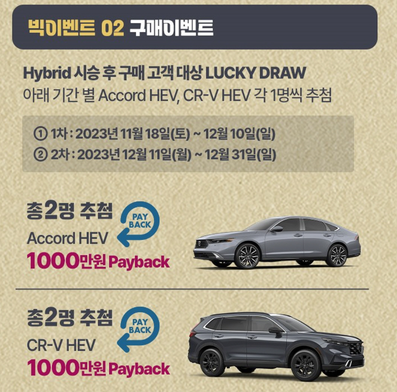 시승을 완료한 모든 고객에게는 모바일 커피 쿠폰을 선물로 제공한다. 또한 올 뉴 어코드 하이브리드 및 올 뉴 CR-V 하이브리드를 시승 후 구매한 고객 중 2명을 추첨하여 차량 구매 비용 1,000만 원을 페이백해주는 파격적인 혜택도 제공된다.