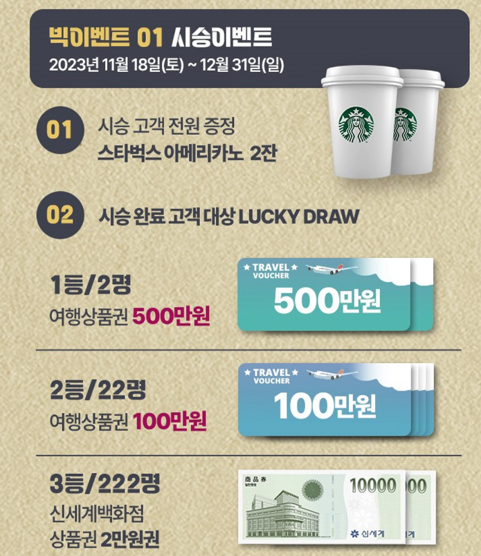 내달 31일까지 전국의 혼다 자동차 전시장을 방문하여 차종과 상관없이 시승을 완료한 고객 중 추첨을 통해 선정된 246명에게는 500만 원 상당의 여행 상품권(2명), 100만 원 상당의 여행 상품권(22명), 2만 원 상당의 신세계 백화점 상품권(222명)을 증정한다.